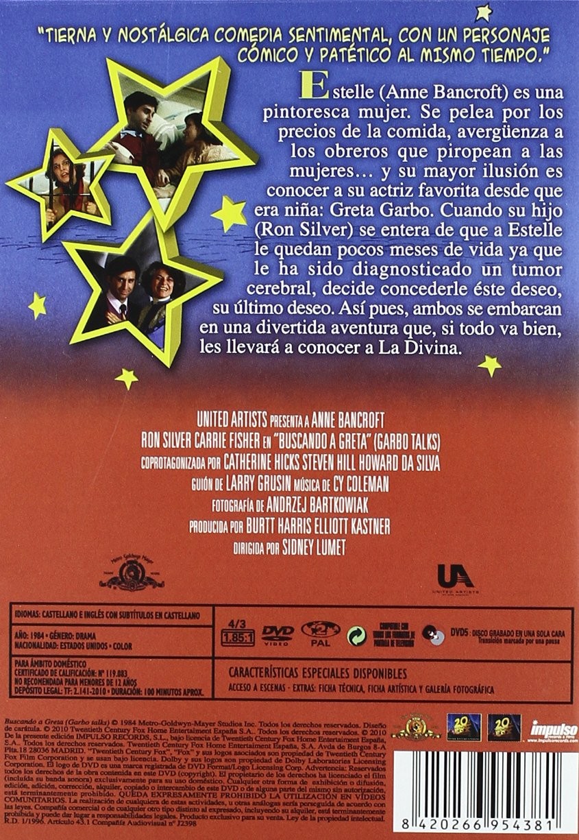 Cantidad de Discos: 1 | Lanzamiento: 2007 | Género(s): Comedia. Drama | Audio: Español, Inglés | Subtítulos: Español | Título: Garbo Talks (1984) | Director(es): Sidney Lumet | Reparto: Anne Bancroft, Ron Silver, Carrie Fisher, Catherine Hicks, Steven Hill, Howard Da Silva, Dorothy Loudon, Harvey Fierstein, Hermione Gingold, Richard B. Shull, Michael Lombard, Ed Crowley, Alice Spivak, Mary McDonnell | Norma / Región: PAL (Región 2) | Cantidad de Discos: 1 | Lanzamiento: 2007 | Género(s): Comedia. Drama | Audio: Español, Inglés | Subtítulos: Español | Título: Garbo Talks (1984) | Director(es): Sidney Lumet | Reparto: Anne Bancroft, Ron Silver, Carrie Fisher, Catherine Hicks, Steven Hill, Howard Da Silva, Dorothy Loudon, Harvey Fierstein, Hermione Gingold, Richard B. Shull, Michael Lombard, Ed Crowley, Alice Spivak, Mary McDonnell | Norma / Región: PAL (Región 2)