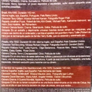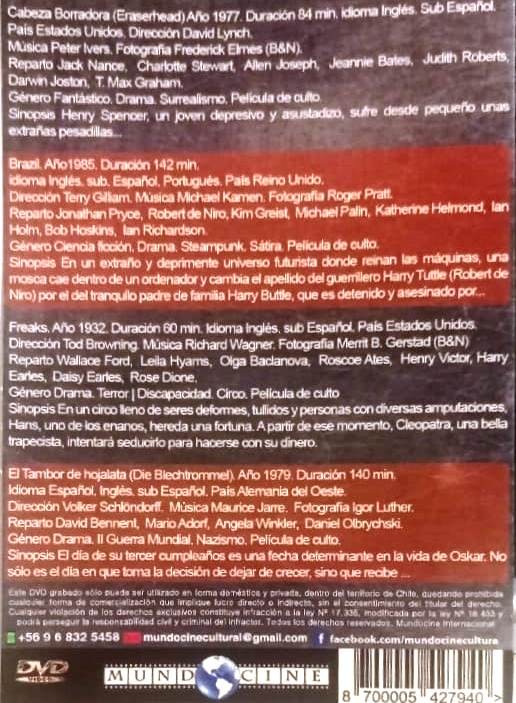 Cantidad de Discos: 4 | Lanzamiento: 2015 | Género(s): Ciencia ficción. Drama. Comedia | Audio: Inglés (Dolby Digital 5,1), Español (Dolby Digital Stereo, Dolby Digital 5,1), Francés (Dolby Digital Stereo, Dolby Digital 5,1) | Subtítulos: Español, Inglés, Portugués | Título: Eraserhead (1977) / Brazil (1985) / Freaks (1932) / Die Blechtrommel (1979) | Director(es): David Lynch / Terry Gilliam / Tod Browning / Volker Schlöndorff | Reparto: Jack Nance, Charlotte Stewart, Allen Joseph, Jeannie Bates, Judith Roberts, Darwin Joston, T. Max Graham //