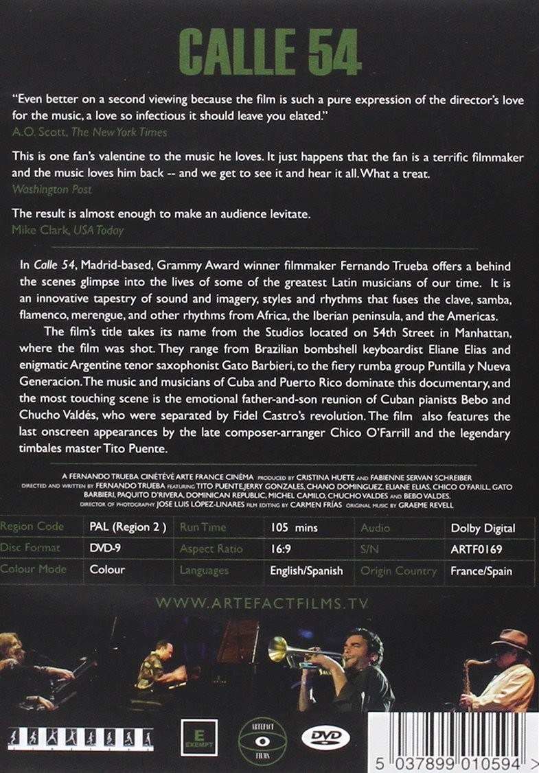Cantidad de Discos: 1 | Lanzamiento: 2000 | Género(s): Documental | Audio: Inglés, Español, Francés | SubtÃtulos: Español, Inglés, Francés | TÃtulo: Calle 54 | Director(es): Fernando Trueba | Reparto: Documental, (intervenciones de: Michel Camilo, Gato Barbieri, Tito Puente, Chucho Valdés, Bebo Valdés, Cachao, Paquito D’Rivera, Chano DomÃnguez) | Norma / Región: PAL (Región 2) | Cantidad de Discos: 1 | Lanzamiento: 2000 | Género(s): Documental | Audio: Inglés, Español, Francés | SubtÃtulos: Español, Inglés, Francés | TÃtulo: Calle 54 | Director(es): Fernando Trueba | Reparto: Documental, (intervenciones de: Michel Camilo, Gato Barbieri, Tito Puente, Chucho Valdés, Bebo Valdés, Cachao, Paquito D’Rivera, Chano DomÃnguez) | Norma / Región: PAL (Región 2)