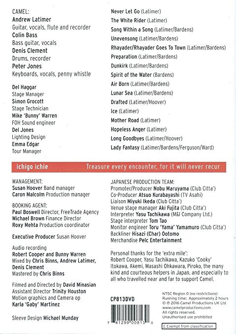 Artista(s) / Grupo: Camel | Cantidad de Discos: 1 | Lanzamiento: 2017 | Género(s): Rock | Estilo(s): Prog Rock | TÃtulo: Ichigo Ichie (Live In Japan 2016) | Norma / Región: PAL (Región 2) | Artista(s) / Grupo: Camel | Cantidad de Discos: 1 | Lanzamiento: 2017 | Género(s): Rock | Estilo(s): Prog Rock | TÃtulo: Ichigo Ichie (Live In Japan 2016) | Norma / Región: PAL (Región 2)