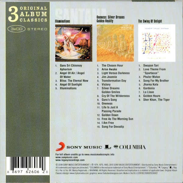 Artista(s) / Grupo: Carlos Santana | Cantidad de Discos: 3 | Lanzamiento: 2010 | Género(s): Jazz, Rock, Latin, Funk / Soul | Estilo(s): Free Jazz, Space-Age, Jazz-Rock, Free Funk, Psychedelic | TÃtulo: 3 Original Album Classics | Artista(s) / Grupo: Carlos Santana | Cantidad de Discos: 3 | Lanzamiento: 2010 | Género(s): Jazz, Rock, Latin, Funk / Soul | Estilo(s): Free Jazz, Space-Age, Jazz-Rock, Free Funk, Psychedelic | TÃtulo: 3 Original Album Classics
