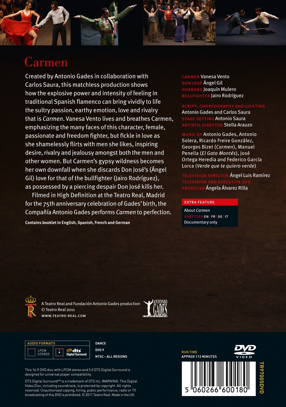 Cantidad de Discos: 1 | Lanzamiento: 2010 | Género(s): Romance. Drama. Baile. | Audio: Español (Dolby Digital 2.0) | Título: Carmen (1983) | Director(es): Carlos Saura | Reparto: Laura del Sol, Antonio Gades, Pepa Flores «Marisol», Cristina Hoyos, Paco de Lucía, Juan Antonio Jiménez, Sebastián Moreno, José Yepes | Norma / Región: Multizona | Cantidad de Discos: 1 | Lanzamiento: 2010 | Género(s): Romance. Drama. Baile. | Audio: Español (Dolby Digital 2.0) | Título: Carmen (1983) | Director(es): Carlos Saura | Reparto: Laura del Sol, Antonio Gades, Pepa Flores «Marisol», Cristina Hoyos, Paco de Lucía, Juan Antonio Jiménez, Sebastián Moreno, José Yepes | Norma / Región: Multizona