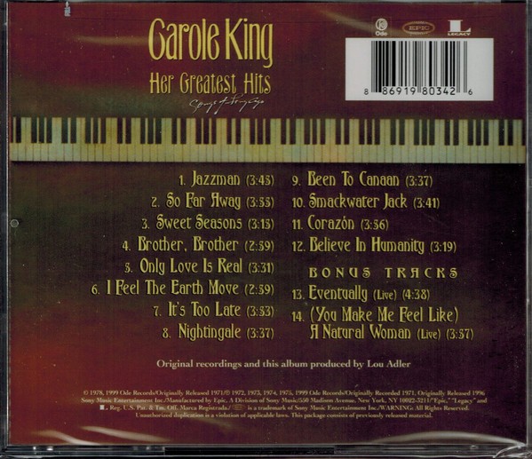 Artista(s) / Grupo: Carole King | Cantidad de Discos: 1 | Lanzamiento: 2012 | Género(s): Rock | Estilo(s): Folk Rock, Pop Rock | Título: Her Greatest Hits (Songs Of Long Ago) | Artista(s) / Grupo: Carole King | Cantidad de Discos: 1 | Lanzamiento: 2012 | Género(s): Rock | Estilo(s): Folk Rock, Pop Rock | Título: Her Greatest Hits (Songs Of Long Ago)
