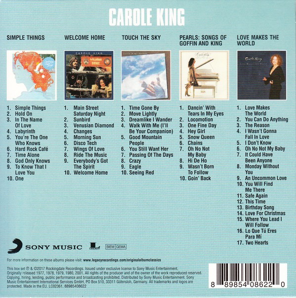 Artista(s) / Grupo: Carole King | Cantidad de Discos: 5 | Lanzamiento: 2017 | Género(s): Rock, Pop, Folk, World, & Country | Estilo(s): Soft Rock | TÃtulo: Original Album Classics | Artista(s) / Grupo: Carole King | Cantidad de Discos: 5 | Lanzamiento: 2017 | Género(s): Rock, Pop, Folk, World, & Country | Estilo(s): Soft Rock | TÃtulo: Original Album Classics