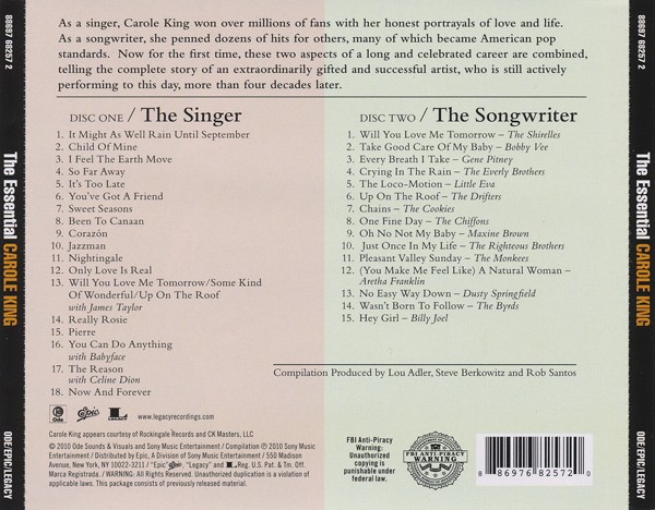 Artista(s) / Grupo: Carole King | Cantidad de Discos: 1 | Lanzamiento: 2010 | Género(s): Rock, Pop | TÃtulo: The Essential Carole King | Artista(s) / Grupo: Carole King | Cantidad de Discos: 1 | Lanzamiento: 2010 | Género(s): Rock, Pop | TÃtulo: The Essential Carole King
