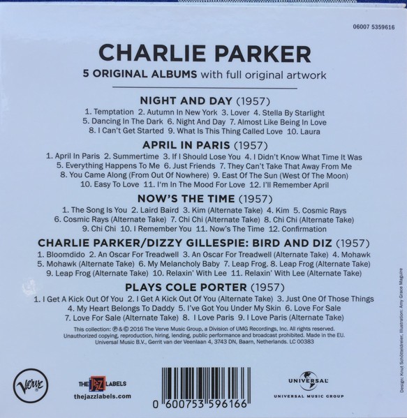 Artista(s) / Grupo: Charlie Parker | Cantidad de Discos: 5 | Lanzamiento: 2016 | Género(s): Jazz | Estilo(s): Bop | TÃtulo: 5 Original Albums | Artista(s) / Grupo: Charlie Parker | Cantidad de Discos: 5 | Lanzamiento: 2016 | Género(s): Jazz | Estilo(s): Bop | TÃtulo: 5 Original Albums