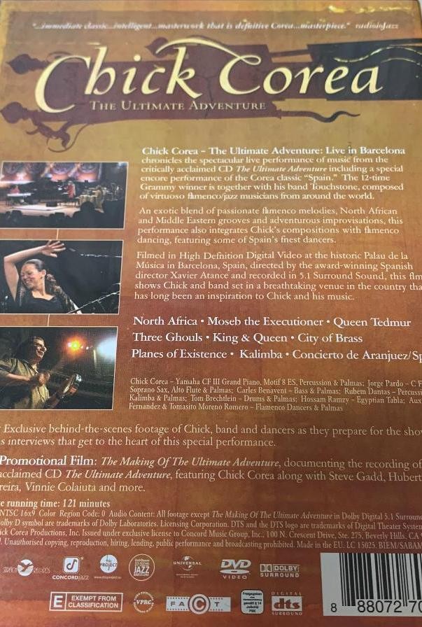 Artista(s) / Grupo: Chick Corea | Cantidad de Discos: 1 | Lanzamiento: 2007 | Género(s): Jazz | Estilo(s): Fusion, Contemporary Jazz | Audio: Inglés (Dolby Digital 5,1) | Título: The Ultimate Adventure: Live In Barcelona | Norma / Región: Multizona | Artista(s) / Grupo: Chick Corea | Cantidad de Discos: 1 | Lanzamiento: 2007 | Género(s): Jazz | Estilo(s): Fusion, Contemporary Jazz | Audio: Inglés (Dolby Digital 5,1) | Título: The Ultimate Adventure: Live In Barcelona | Norma / Región: Multizona