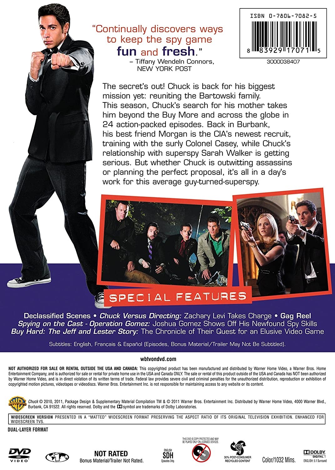 Cantidad de Discos: 5 | Lanzamiento: 2007 | Género(s): Serie de TV. Acción. Comedia. | Audio: Español, Inglés, Francés | Subtítulos: Español, Inglés, Francés | Título: Chuck – Temporada 4 | Director(es): Chris Fedak, Josh Schwartz, Robert Duncan McNeill, Fred Toye, Allan Kroeker, McG, Patrick R. Norris, Peter Lauer, Jay Chandrasekhar, Michael Schultz, Jason Ensler, Norman Buckley, Milan Cheylov, Jeremiah Chechik. | Reparto: Zachary Levi, Yvonne Strahovski, Joshua Gomez, Sarah Lancaster, Adam Baldwin, Vik Sahay, Scott Krinsky, Bonita Friedericy, Ryan McPartlin, Tony Todd, Julia Ling, Mark Christopher Lawrence, C.S. Lee, Matt Bomer, Linda Hamilton, Lauren Cohan, Rachel Bilson, Mekenna Melvin, Tony Hale, Jesse Heiman, Kristin Kreuk, Jordana Brewster, Timothy Dalton, Mini Anden, Robin Givens, Morgan Fairchild, Mercedes Mason, Stacy Keibler, Richard Burgi, Noureen DeWulf, Ivana Milicevic. | Norma / Región: NTSC (Región A) | Cantidad de Discos: 5 | Lanzamiento: 2007 | Género(s): Serie de TV. Acción. C