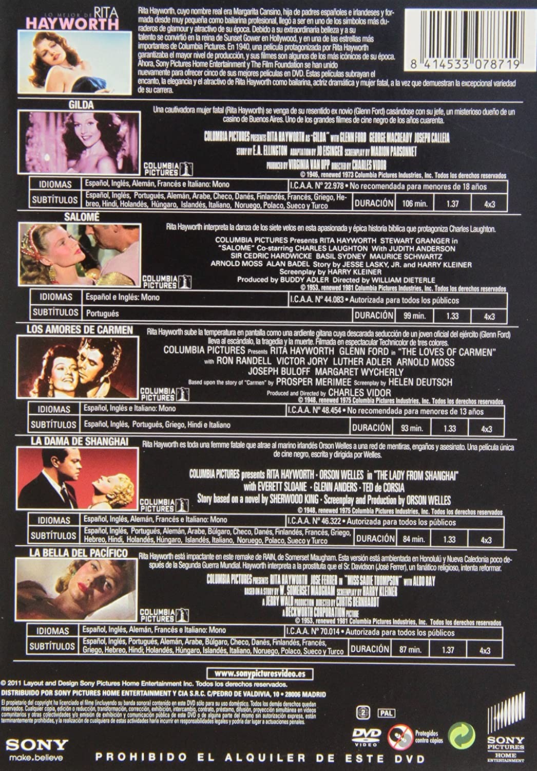 Cantidad de Discos: 5 | Lanzamiento: 2011 | Género(s): Cine negro. Drama. Romance. Thriller. Épico. Intriga. | Audio: Inglés (Dolby Digital 5,1), Español (Dolby Digital Stereo, Dolby Digital 5,1), Francés (Dolby Digital Stereo, Dolby Digital 5,1) | Subtítulos: Español, Francés, Checo, Húngaro, Polaco, Danés, Holandés, Finlandés, Noruego, Sueco, Inglés para Sordos, | Título: Gilda (1946) / Salome (1953) / The Loves of Carmen (1948) / The Lady From Shanghai (1947) / La mujer de Satanás o Miss Sadie Thompson (1953) | Director(es): Charles Vidor / William Dieterle / Charles Vidor / Orson Welles / Curtis Bernhardt | Reparto: Rita Hayworth, Glenn Ford, George Macready, Joseph Calleia, Steven Geray, Rosa Rey, Joe Sawyer, Gerald Mohr, Mark Roberts, Ludwig Donath, Donald Douglas, Lionel Royce, Saul Martell /