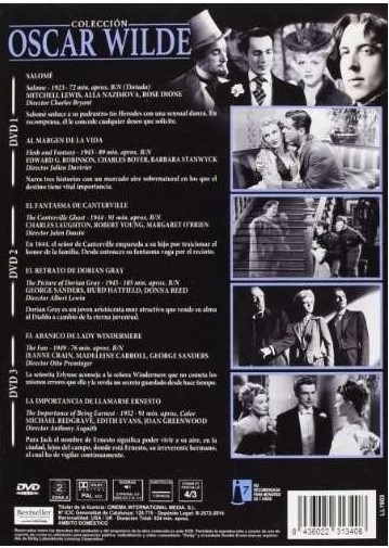 Cantidad de Discos: 3 | Lanzamiento: 2014 | Género(s): Comedia, Suspenso, Drama | Audio: Español (Dolby Digital 2.0), Inglés (Dolby Digital 2.0) | SubtÃtulos: Español | TÃtulo: Oscar Wilde – Colección | Director(es): Charles Bryant, Julien Duvivier, Jules Dassin, Albert Lewin, Otto Preminger, Anthony Asquith | Reparto: Mitchell Lewis, Alla Nazimova, Edward G. Robinson, Charles Boyer, Barbara Stanwyck | Norma / Región: PAL (Región 2) | Cantidad de Discos: 3 | Lanzamiento: 2014 | Género(s): Comedia, Suspenso, Drama | Audio: Español (Dolby Digital 2.0), Inglés (Dolby Digital 2.0) | SubtÃtulos: Español | TÃtulo: Oscar Wilde – Colección | Director(es): Charles Bryant, Julien Duvivier, Jules Dassin, Albert Lewin, Otto Preminger, Anthony Asquith | Reparto: Mitchell Lewis, Alla Nazimova, Edward G. Robinson, Charles Boyer, Barbara Stanwyck | Norma / Región: PAL (Región 2)