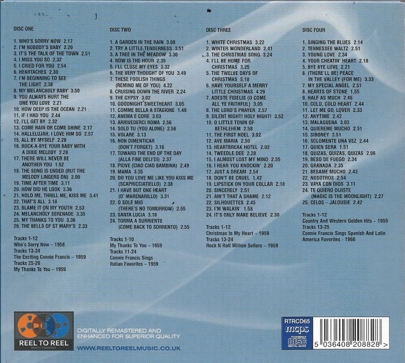 Artista(s) / Grupo: Connie Francis | Cantidad de Discos: 4 | Género(s): Pop | Estilo(s): Vocal, Ballad, Latin | Título: Eight Classic Albums | Norma / Región: NTSC (Región 1, 4) | Artista(s) / Grupo: Connie Francis | Cantidad de Discos: 4 | Género(s): Pop | Estilo(s): Vocal, Ballad, Latin | Título: Eight Classic Albums | Norma / Región: NTSC (Región 1, 4)