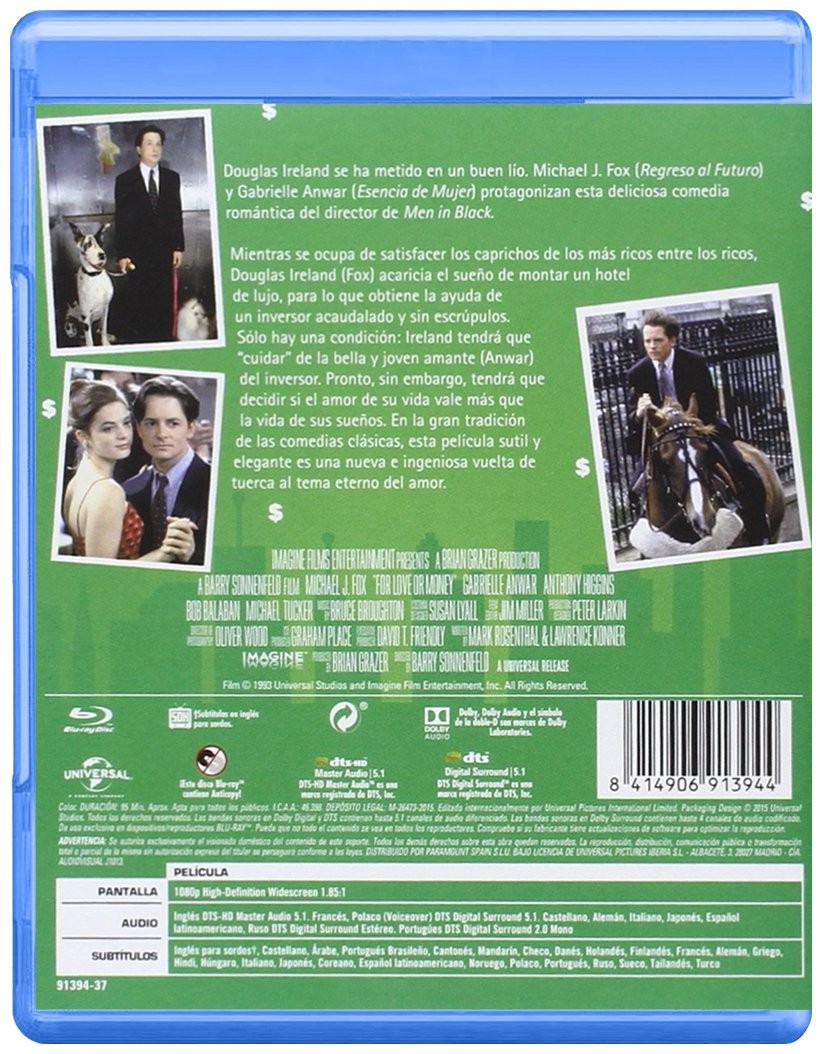Cantidad de Discos: 1 | Lanzamiento: 2015 | Género(s): Comedia | Audio: Español, Italiano, Alemán, Inglés, Portugués, Francés, Polaco, Japonés, Español latino, Ruso | SubtÃtulos: Español, Francés, Checo, Húngaro, Polaco, Danés, Holandés, Finlandés, Noruego, Sueco, Inglés para Sordos, | TÃtulo: For Love or Money (1993) | Director(es): Barry Sonnenfeld | Reparto: Michael J. Fox, Gabrielle Anwar, Anthony Higgins, Michael Tucker, Bob Balaban, Udo Kier | Norma / Región: Multizona | Cantidad de Discos: 1 | Lanzamiento: 2015 | Género(s): Comedia | Audio: Español, Italiano, Alemán, Inglés, Portugués, Francés, Polaco, Japonés, Español latino, Ruso | SubtÃtulos: Español, Francés, Checo, Húngaro, Polaco, Danés, Holandés, Finlandés, Noruego, Sueco, Inglés para Sordos, | TÃtulo: For Love or Money (1993) | Director(es): Barry Sonnenfeld | Reparto: Michael J. Fox, Gabrielle Anwar, Anthony Higgins, Michael Tucker, Bob Balaban, Udo Kier | Norma / Región: Multizona