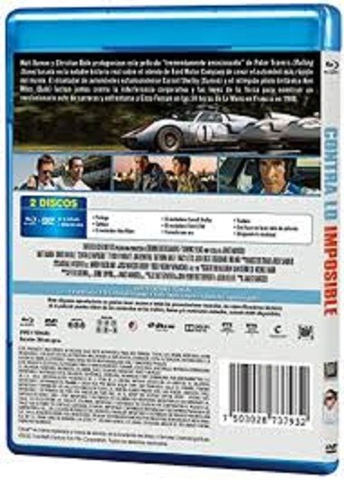 Cantidad de Discos: 1 Blu ray + 1 DVD | Lanzamiento: 2019 | Género(s): Drama. Acción. Biográfico | Audio: Español (Dolby Digital 5,1), Inglés (Dolby Digital 5,1) | SubtÃtulos: Español, Inglés | TÃtulo: Ford v. Ferrari | Director(es): James Mangold | Reparto: Matt Damon, Christian Bale, Jon Bernthal, Caitriona Balfe, Noah Jupe, Josh Lucas, Tracy Letts, JJ Feild, Ray McKinnon, Rudolf Martin, Ward Horton, Bridie Latona, Lachlan Buchanan, Christopher Darga, Sean Carrigan, Ian Harding, Wallace Langham, Wyatt Nash, Jonathan LaPaglia, Stefania Spampinato, Jenelle McKee, Marisa Petroro, Benjamin Rigby, Brea Bee, Andrew Burlinson, Adam Stuart, Roberta Sparta, Remo Girone, Darin Cooper | Norma / Región: Multizona | Cantidad de Discos: 1 Blu ray + 1 DVD | Lanzamiento: 2019 | Género(s): Drama. Acción. Biográfico | Audio: Español (Dolby Digital 5,1), Inglés (Dolby Digital 5,1) | SubtÃtulos: Español, Inglés | TÃtulo: Ford v. Ferrari | Director(es): James Mangold | Reparto: Matt Damon, Christian Bale, J