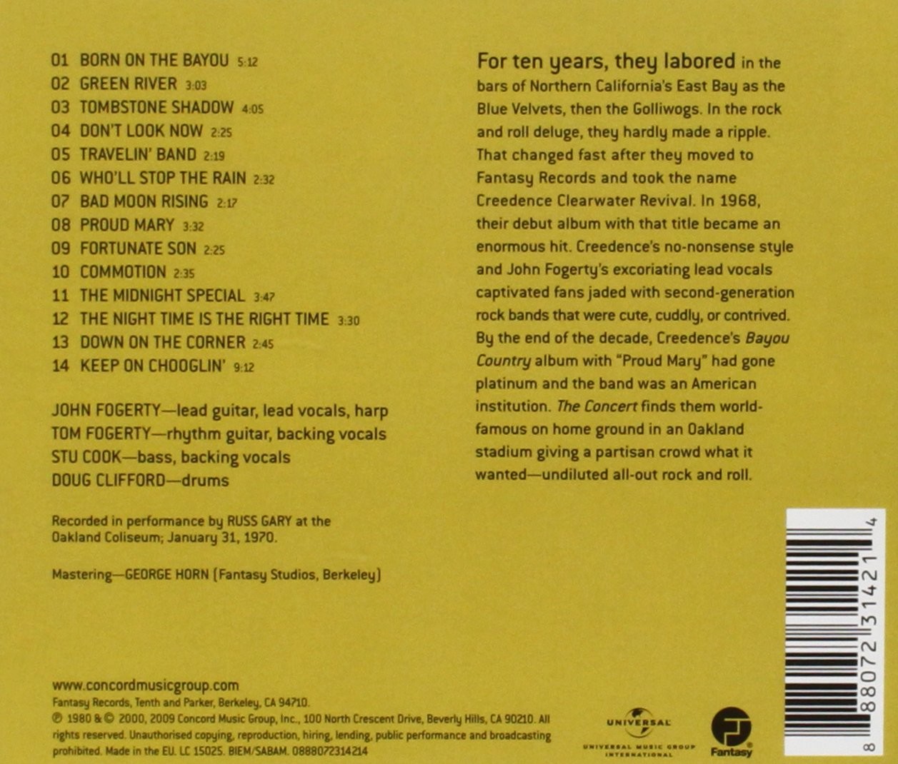 Artista(s) / Grupo: Creedence Clearwater Revival | Cantidad de Discos: 1 | Lanzamiento: 2009 | Género(s): Rock | Estilo(s): Folk Rock, Classic Rock | TÃtulo: The Concert | Artista(s) / Grupo: Creedence Clearwater Revival | Cantidad de Discos: 1 | Lanzamiento: 2009 | Género(s): Rock | Estilo(s): Folk Rock, Classic Rock | TÃtulo: The Concert