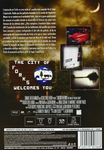 Crepúsculo en Forks es una visita al pueblo más popular de la Saga Crepúsculo. Dado que las películas basadas en la novela de Stephenie Meyer no se ruedan en el verdadero Forks, esta es tu gran oportunidad de conocer el pueblo donde se desarrolla la historia de amor más famosa de los últimos años. ¿Hay vampiros y hombres lobos reales allí? Escucha los testimonios de los habitantes del pueblo que tantos fans conocen y aman, incluyendo el del jefe de policía, el de la encargada del supermercado de Forks a la que a veces confunden con Bella, y el de la vampira que hace de Alice en la vida real. Visita el instituto de Forks, escucha a quien dice ser el abuelo de Jacob contar la leyenda de cómo los Quileutes descendieron de los lobos, y descubre muchos más lugares y personas que hacen de Forks y La Push el escenario perfecto para la Saga Crepúsculo. -información de la distribuidora