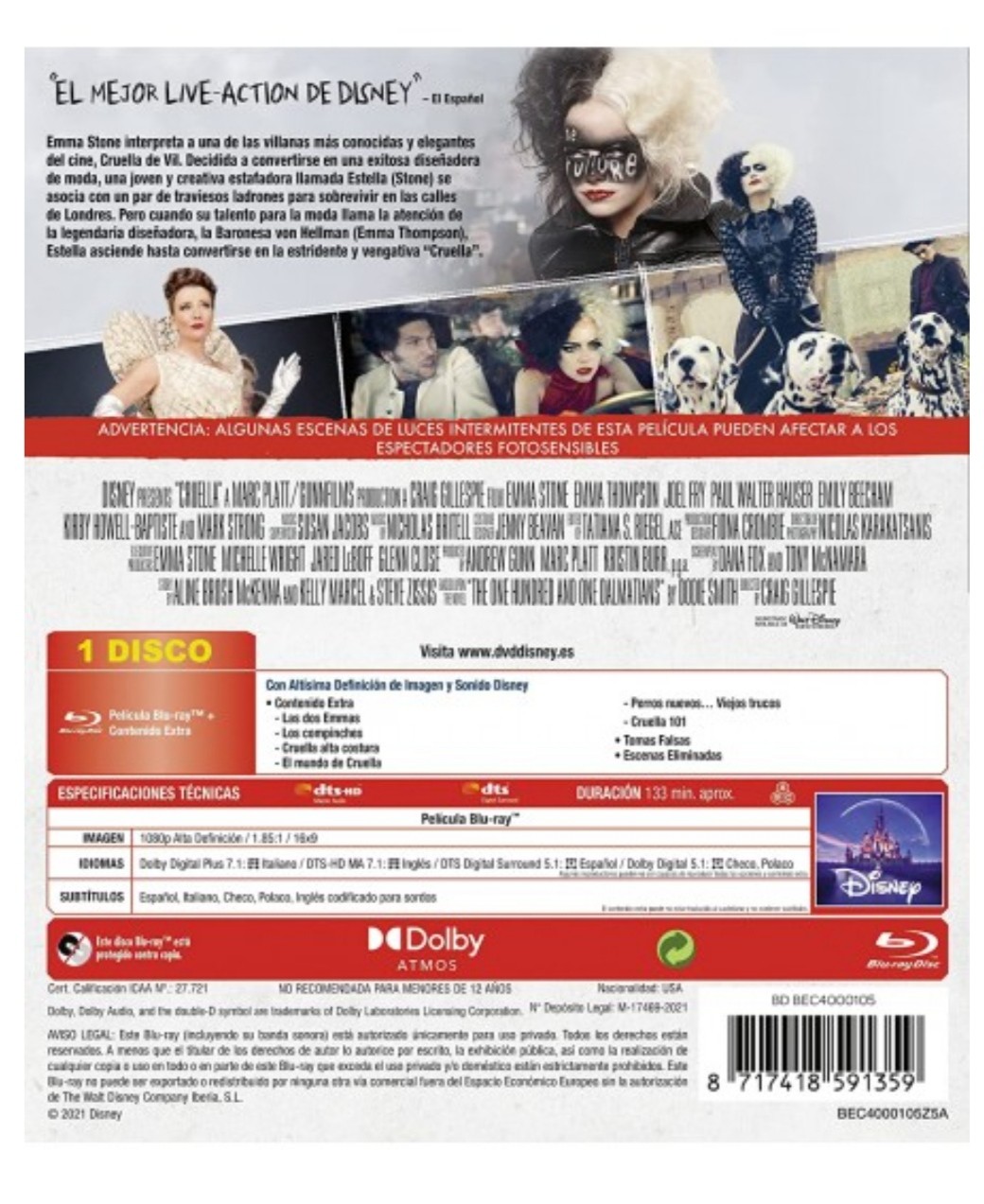 Cantidad de Discos: 1 BLR | Lanzamiento: 2021 | Género(s): Comedia, Thriller, Crimen | Audio: Italiano, Inglés, Español | SubtÃtulos: Español, Italiano, Checo, Polaco, Inglés | TÃtulo: Cruella | Director(es): Craig Gillespie | Reparto: Emma Stone, Emma Thompson, Joel Fry, Emily Beecham, Mark Strong | Norma / Región: Multizona | Cantidad de Discos: 1 BLR | Lanzamiento: 2021 | Género(s): Comedia, Thriller, Crimen | Audio: Italiano, Inglés, Español | SubtÃtulos: Español, Italiano, Checo, Polaco, Inglés | TÃtulo: Cruella | Director(es): Craig Gillespie | Reparto: Emma Stone, Emma Thompson, Joel Fry, Emily Beecham, Mark Strong | Norma / Región: Multizona