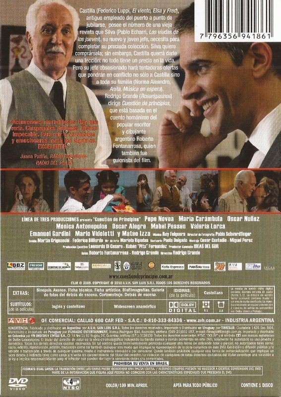 Cantidad de Discos: 1 | Lanzamiento: 2009 | Género(s): Drama | Audio: Español | SubtÃtulos: Inglés ,Español | TÃtulo: Cuestion de Principios | Director(es): Rodrigo Grande | Reparto: Federico Luppi, Norma Aleandro, Pablo Echarri, MarÃa Carámbula, Pepe Novoa, Óscar Núñez, Mónica Antonopulos, Mabel Pessen | Sub-CategorÃas: Comedia | Norma / Región: NTSC 4 | Cantidad de Discos: 1 | Lanzamiento: 2009 | Género(s): Drama | Audio: Español | SubtÃtulos: Inglés ,Español | TÃtulo: Cuestion de Principios | Director(es): Rodrigo Grande | Reparto: Federico Luppi, Norma Aleandro, Pablo Echarri, MarÃa Carámbula, Pepe Novoa, Óscar Núñez, Mónica Antonopulos, Mabel Pessen | Sub-CategorÃas: Comedia | Norma / Región: NTSC 4
