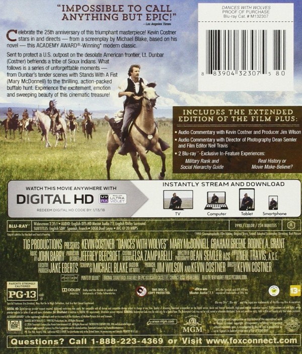 Reparto: Kevin Costner, Mary McDonnell, Graham Greene, Rodney A. Grant, Maury Chaykin, Tantoo Cardinal, Wes Studi, Robert Pastorelli, Floyd ‘Red Crow’ Westerman, Steve Reevis, Charles Rocket