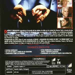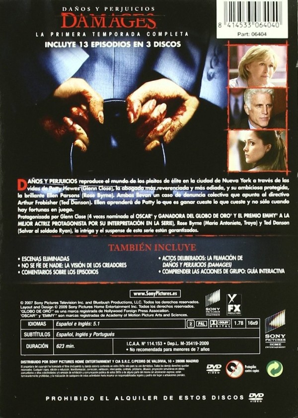 Cantidad de Discos: 3 | Lanzamiento: 2007 | Género(s): Serie de TV. Intriga. | Audio: Español, Inglés, Francés | Subtítulos: Español, Inglés, Francés | Título: Damages – Season 1 | Director(es): Glenn Kessler, Todd A. Kessler, Daniel Zelman, Timothy Busfield, Matthew Penn, Mario Van Peebles, Tate Donovan. | Reparto: Glenn Close, Rose Byrne, Tate Donovan, Ted Danson, Zachary Booth, Anastasia Griffith, Timothy Olyphant, Michael Nouri, Zeljko Ivanek, Tom Noonan, William Hurt, Marcia Gay Harden, Martin Short, Noah Bean, Campbell Scott, Glenn Kessler, David Costabile, Mario Van Peebles, John Goodman, Lily Tomlin, Dylan Baker, Peter Facinelli, Len Cariou, Chris Messina, Philip Bosco, Debra Monk, Ben Shenkman, Casey Siemaszko, Takako Haywood, Ryan Phillippe, Gillian Alexy, John Hannah, Michael Pemberton, John Doman, Janet McTeer, Mädchen Amick, Keith Carradine, Seamus Davey-Fitzpatrick, Bill Camp, Judd Hirsch, Tom Aldredge. | Norma / Región: PAL (Región 2) | Cantidad de Discos: 3 | Lanzamiento: 2007 | G