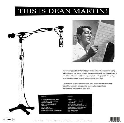 Artista(s) / Grupo: Dean Martin | Cantidad de Discos: 1 LP | Lanzamiento: 2017 | Género(s): Pop | Estilo(s): Big Band, Easy Listening, Vocal | TÃtulo: This Is Dean Martin! | Artista(s) / Grupo: Dean Martin | Cantidad de Discos: 1 LP | Lanzamiento: 2017 | Género(s): Pop | Estilo(s): Big Band, Easy Listening, Vocal | TÃtulo: This Is Dean Martin!