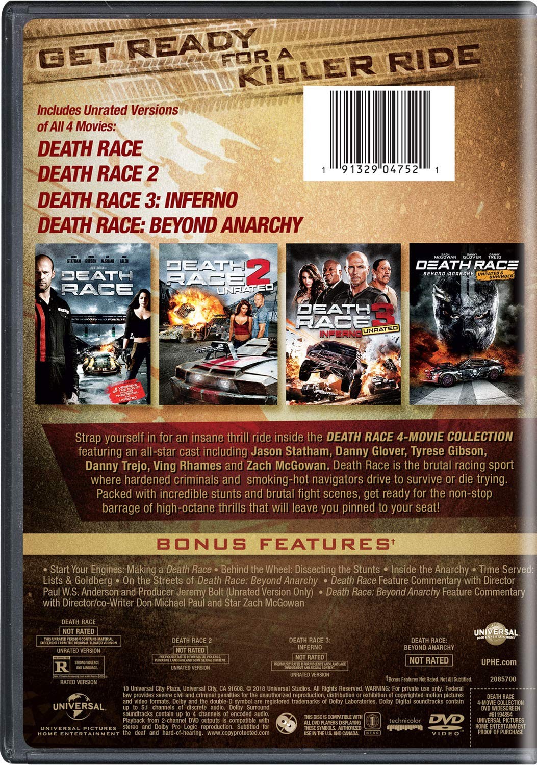 Cantidad de Discos: 3 | Lanzamiento: 2018 | Género(s): Acción. Aventuras. Ciencia ficción. Thriller | Audio: Español, Inglés, Francés (Dolby Digital 5,1) Película 1 y 4 / 2 y 3 solo Inglés, Francés | Subtítulos: Español, Inglés, Francés Película 1 y 4 / 2 y 3 solo Inglés, Francés | Título: La carrera de la muerte (2008) / La carrera de la muerte 2 (2010) / La carrera de la muerte 3: Infierno (2013) /La carrera de la muerte 4: Anarquía (2018) | Director(es): Paul W.S. Anderson / Roel Reiné / Roel Reiné / Don Michael Paul | Reparto: Jason Statham, Joan Allen, Tyrese Gibson, Ian McShane, Natalie Martinez, Max Ryan, Jacob Vargas, Frederick Koehler, Justin Mader, Jason Clarke, Robert LaSardo, Robin Shou /