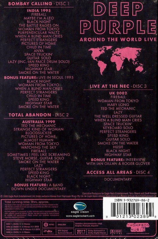 Artista(s) / Grupo: Deep Purple | Cantidad de Discos: 4 DVD + Libro | Lanzamiento: 2008 | Género(s): Rock | Estilo(s): Hard Rock | TÃtulo: Around The World Live | Norma / Región: Multizona | Artista(s) / Grupo: Deep Purple | Cantidad de Discos: 4 DVD + Libro | Lanzamiento: 2008 | Género(s): Rock | Estilo(s): Hard Rock | TÃtulo: Around The World Live | Norma / Región: Multizona | Artista(s) / Grupo: Deep Purple | Cantidad de Discos: 4 DVD + Libro | Lanzamiento: 2008 | Género(s): Rock | Estilo(s): Hard Rock | TÃtulo: Around The World Live | Norma / Región: Multizona