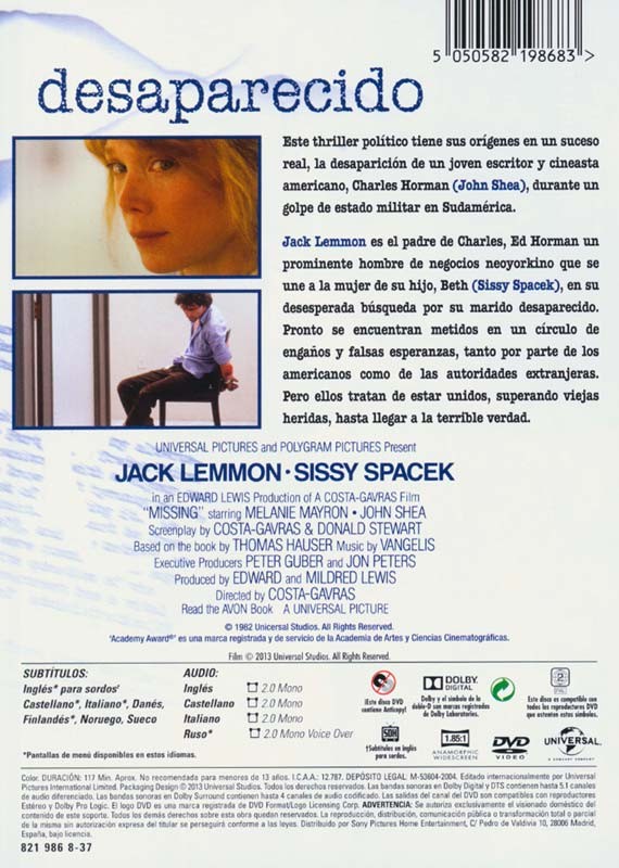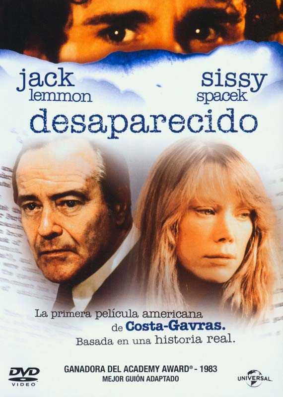 | Norma / Región: PAL 2 | Cantidad de Discos: 1 DVD | Lanzamiento: 1982 | Género(s): Drama, Basada en hechos reales | Audio: Inglés, Español, Italiano | SubtÃtulos: Inglés, Español, Italiano, Danés | TÃtulo: Missing | Director(es): Costa-Gavras | Reparto: Jack Lemmon, Sissy Spacek, Melanie Mayron, John Shea, Charles Cioffi, Richard Bradford, Janice Rule, David Clennon, Jerry Hardin, Martin Lasalle