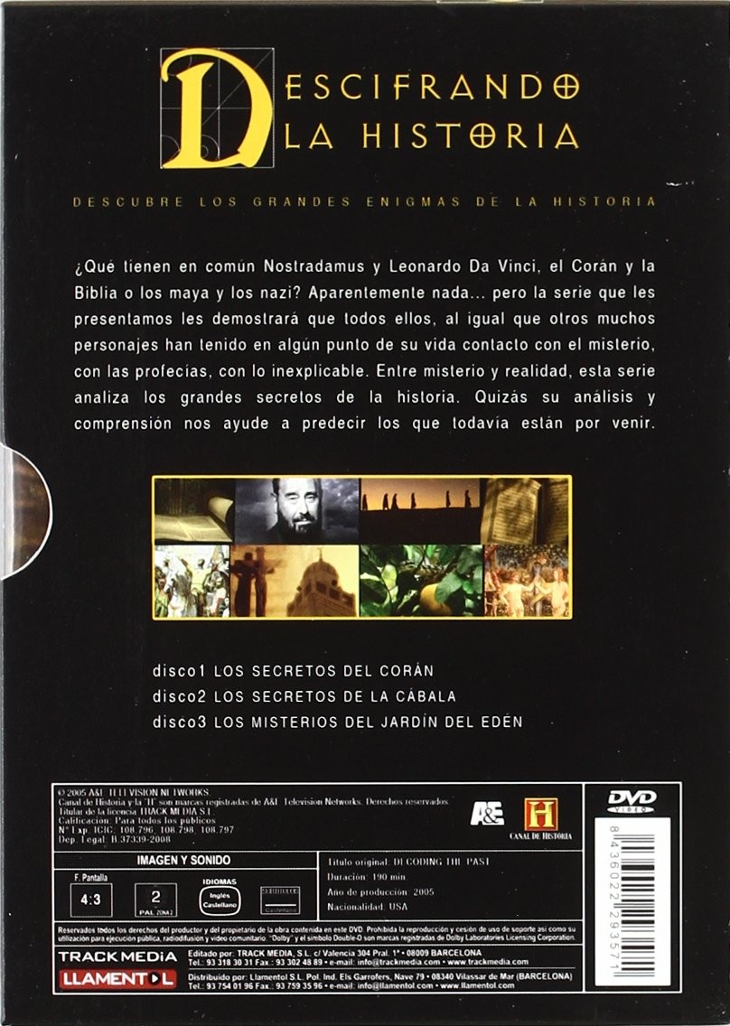 Episodios: Disco 1: Los Secretos del Corán El Corán es uno de los libros sagrados que más influencia ha ejercido a lo largo de la historia. Los musulmanes creen que el Corán es la guÃa de Dios, el libro de consulta para ayudar a los creyentes a seguir el camino correcto. Sin embargo, gran parte del mundo no-musulmán ve el Corán como un texto envuelto en misterio… y controversia. Como cualquier escrito sagrado, el Corán no puede separarse de su contexto histórico.. Disco 2: Los Secretos de la Cábala Hoy en dÃa, el estudio de la Cábala se ha puesto de moda entre algunos famosos y multimillonarios americanos. Sin embargo, los historiadores y los estudios han manifestado que la Cábala de la élite de Hollywood es un pálido reflejo de esta práctica mÃstica que cuenta con siglos de antigüedad. Disco 3: Los Secretos del JardÃn del Edén La Biblia dice que el Edén estaba situado al este de Israel, en la confluencia de cuatro rÃos. El Tigris y el Éufrates existen en la realidad en Irak, pero durante mucho tiempo se ha considerado que el rÃo Pisón y el rÃo Gihón son mÃticos.