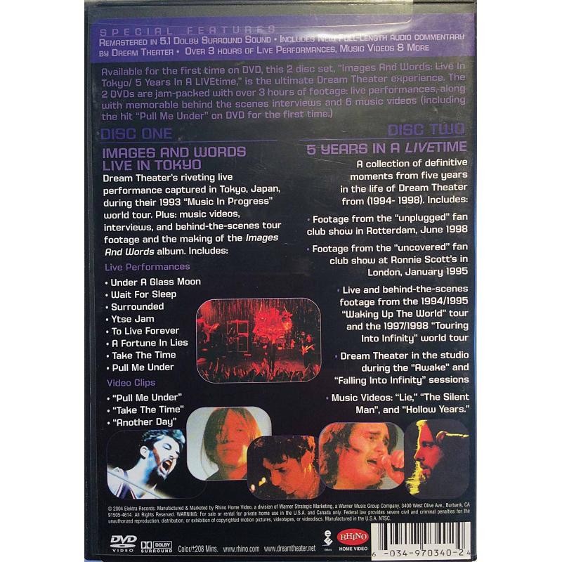 Artista(s) / Grupo: Dream Theater | Cantidad de Discos: 2 | Lanzamiento: 2004 | Género(s): Rock | Estilo(s): Hard Rock, Heavy Metal | Audio: Inglés (Dolby Digital 5,1) | TÃtulo: Double Feature: Images And Words, Live In Tokyo / Dream Theater, 5 Years In A Live Time | Norma / Región: Multizona | Artista(s) / Grupo: Dream Theater | Cantidad de Discos: 2 | Lanzamiento: 2004 | Género(s): Rock | Estilo(s): Hard Rock, Heavy Metal | Audio: Inglés (Dolby Digital 5,1) | TÃtulo: Double Feature: Images And Words, Live In Tokyo / Dream Theater, 5 Years In A Live Time | Norma / Región: Multizona