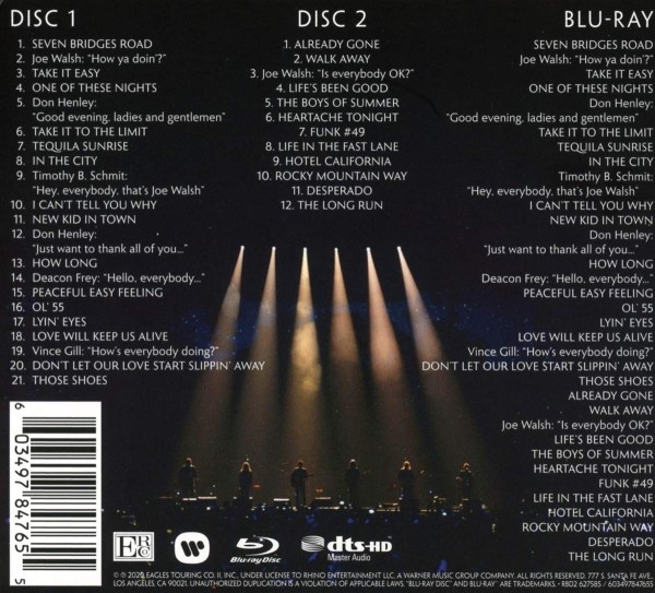 Artista(s) / Grupo: Eagles | Cantidad de Discos: 1 Bluray + 2 CD | Lanzamiento: 2020 | Género(s): Rock, Folk, World, & Country | Estilo(s): Classic Rock | Título: Live From The Forum MMXVIII | Artista(s) / Grupo: Eagles | Cantidad de Discos: 1 Bluray + 2 CD | Lanzamiento: 2020 | Género(s): Rock, Folk, World, & Country | Estilo(s): Classic Rock | Título: Live From The Forum MMXVIII | Artista(s) / Grupo: Eagles | Cantidad de Discos: 1 Bluray + 2 CD | Lanzamiento: 2020 | Género(s): Rock, Folk, World, & Country | Estilo(s): Classic Rock | Título: Live From The Forum MMXVIII