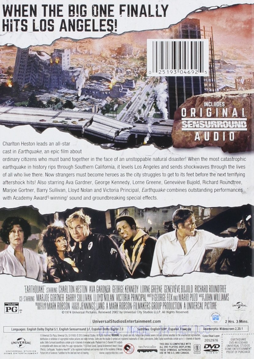 Cantidad de Discos: 1 | Lanzamiento: 1974 | Género(s): Acción. Drama | Audio: Español, Inglés, Francés | Subtítulos: Español, Inglés, Francés | Título: Earthquake | Director(es): Mark Robson | Reparto: Charlton Heston, Ava Gardner, George Kennedy, Geneviève Bujold, Lorne Greene, Richard Roundtree, Walter Matthau, Marjoe Gortner, Barry Sullivan, Lloyd Nolan, Victoria Principal, Pedro Armendáriz Jr. | Norma / Región: NTSC (Región A) | Cantidad de Discos: 1 | Lanzamiento: 1974 | Género(s): Acción. Drama | Audio: Español, Inglés, Francés | Subtítulos: Español, Inglés, Francés | Título: Earthquake | Director(es): Mark Robson | Reparto: Charlton Heston, Ava Gardner, George Kennedy, Geneviève Bujold, Lorne Greene, Richard Roundtree, Walter Matthau, Marjoe Gortner, Barry Sullivan, Lloyd Nolan, Victoria Principal, Pedro Armendáriz Jr. | Norma / Región: NTSC (Región A)