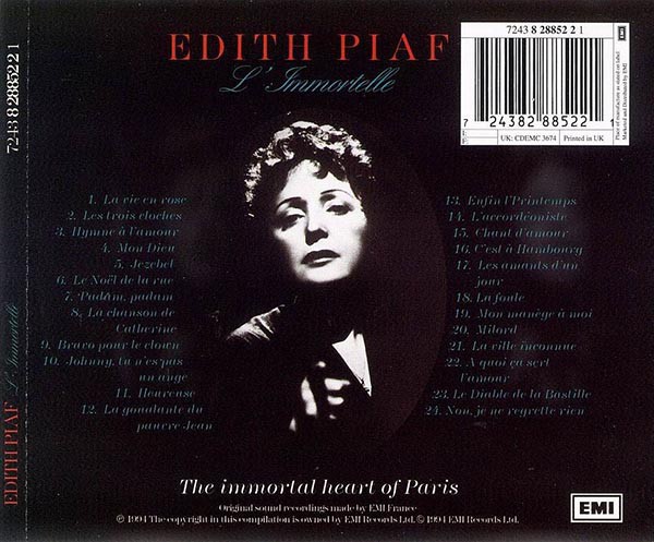 Artista(s) / Grupo: Edith Piaf | Cantidad de Discos: 1 | Lanzamiento: 1994 | Género(s): Pop | Estilo(s): Chanson | TÃtulo: L’ Immortelle | Artista(s) / Grupo: Edith Piaf | Cantidad de Discos: 1 | Lanzamiento: 1994 | Género(s): Pop | Estilo(s): Chanson | TÃtulo: L’ Immortelle