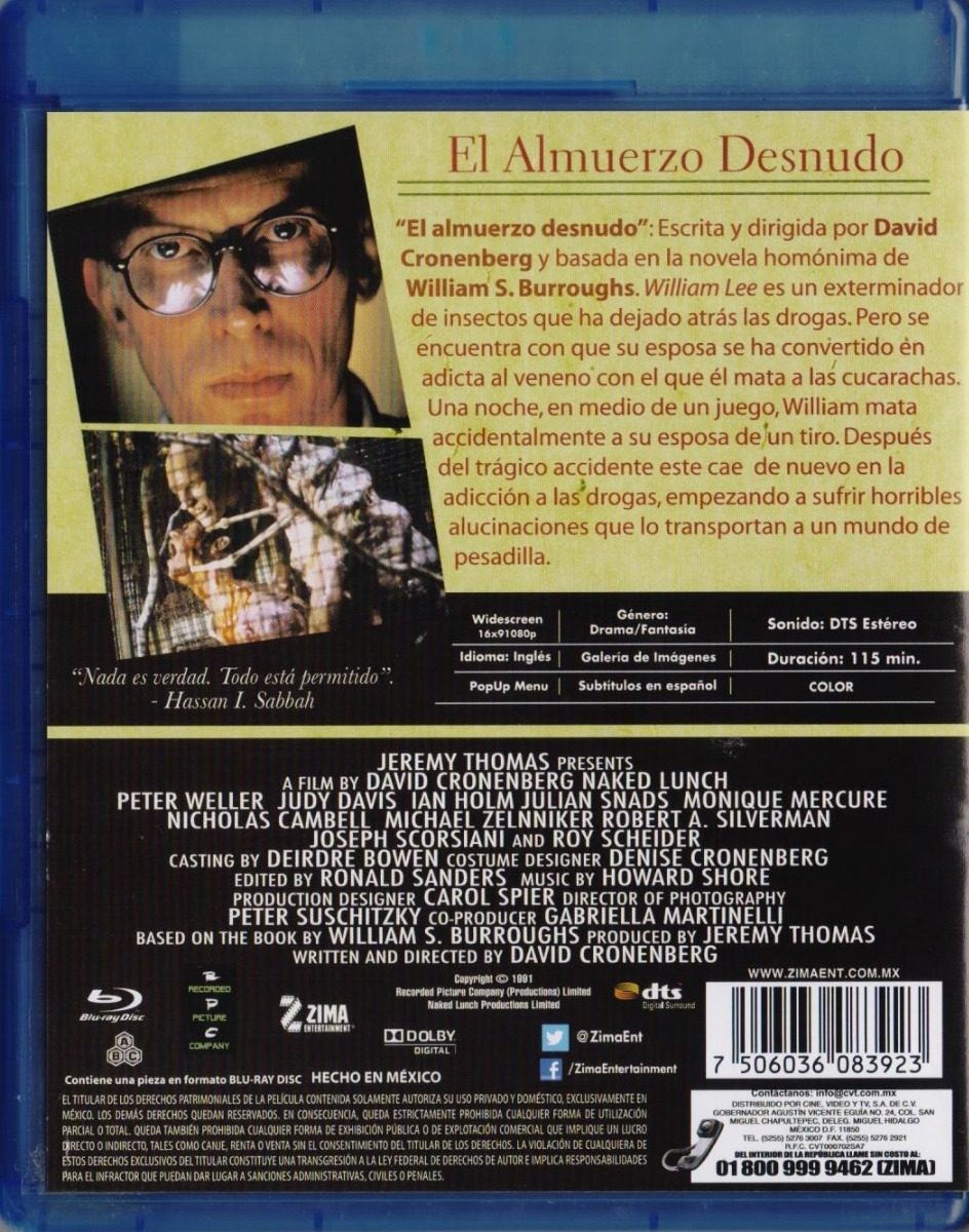 Cantidad de Discos: 1 | Lanzamiento: 1991 | Género(s): Drama, Fantasía | Audio: Inglés | Subtítulos: Español | Título: Naked Luch | Director(es): David Cronenberg | Reparto: Peter Weller, Judy Davis, Ian Holm, Julian Sands, Roy Scheider, Nicholas Campbell, Monique Mercure, Michael Zelniker, Joseph Scorsiani, Robert A. Silverman | Norma / Región: Multizona | Cantidad de Discos: 1 | Lanzamiento: 1991 | Género(s): Drama, Fantasía | Audio: Inglés | Subtítulos: Español | Título: Naked Luch | Director(es): David Cronenberg | Reparto: Peter Weller, Judy Davis, Ian Holm, Julian Sands, Roy Scheider, Nicholas Campbell, Monique Mercure, Michael Zelniker, Joseph Scorsiani, Robert A. Silverman | Norma / Región: Multizona