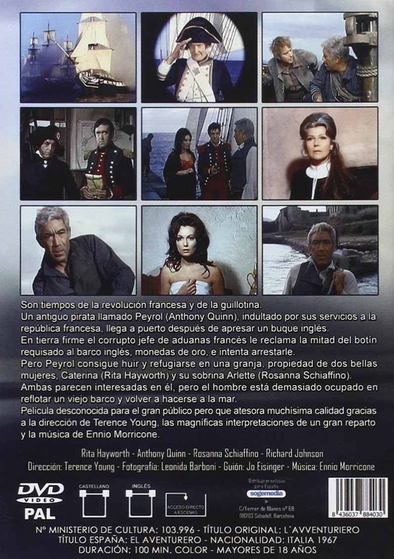 Cantidad de Discos: 1 | Lanzamiento: 2015 | Género(s): Aventuras, Drama | Audio: Español, Inglés | Título: L’avventuriero (1967) | Director(es): Terence Young | Reparto: Anthony Quinn, Rosanna Schiaffino, Rita Hayworth, Richard Johnson, Anthony Dawson, Luciano Rossi, Mino Doro, Giulio Marchetti | Norma / Región: PAL (Región 2) | Cantidad de Discos: 1 | Lanzamiento: 2015 | Género(s): Aventuras, Drama | Audio: Español, Inglés | Título: L’avventuriero (1967) | Director(es): Terence Young | Reparto: Anthony Quinn, Rosanna Schiaffino, Rita Hayworth, Richard Johnson, Anthony Dawson, Luciano Rossi, Mino Doro, Giulio Marchetti | Norma / Región: PAL (Región 2)
