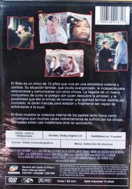 Cantidad de Discos: 1 | Lanzamiento: 2000 | Género(s): Drama | SubtÃtulos: Español | TÃtulo: El Bola | Director(es): Achero Mañas | Reparto: Juan José Ballesta, Pablo Galán, Manuel Morón, Alberto Jiménez, Ana Wagener, Nieve de Medina, Gloria Muñoz, Javier Lago, Soledad Osorio, Máximo Jiménez | Norma / Región: NTSC (Región 1, 4) | Cantidad de Discos: 1 | Lanzamiento: 2000 | Género(s): Drama | SubtÃtulos: Español | TÃtulo: El Bola | Director(es): Achero Mañas | Reparto: Juan José Ballesta, Pablo Galán, Manuel Morón, Alberto Jiménez, Ana Wagener, Nieve de Medina, Gloria Muñoz, Javier Lago, Soledad Osorio, Máximo Jiménez | Norma / Región: NTSC (Región 1, 4)