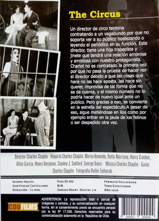 Lanzamiento: 2000 | Género(s): Comedia | Audio: Inglés (Dolby Digital 2,0 Stereo) | SubtÃtulos: Español | TÃtulo: The Circus (1928) | Director(es): Charles Chaplin | Reparto: Charles Chaplin, Merna Kennedy, Betty Morrisey, Harry Crocker, Allan GarcÃa, Henry Bergman, Stanley J. Sanford, George Davis | Norma / Región: NTSC (Región 1, 4) | Lanzamiento: 2000 | Género(s): Comedia | Audio: Inglés (Dolby Digital 2,0 Stereo) | SubtÃtulos: Español | TÃtulo: The Circus (1928) | Director(es): Charles Chaplin | Reparto: Charles Chaplin, Merna Kennedy, Betty Morrisey, Harry Crocker, Allan GarcÃa, Henry Bergman, Stanley J. Sanford, George Davis | Norma / Región: NTSC (Región 1, 4)