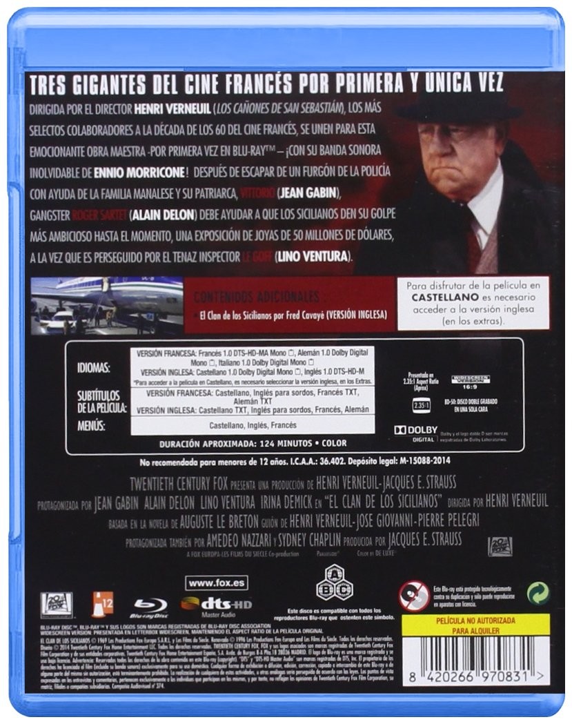 Cantidad de Discos: 1 | Lanzamiento: 1969 | Género(s): Intriga | Audio: Inglés, Francés, Español, Italiano, Portugués | SubtÃtulos: Inglés, Francés, Español, Italiano, Portugués | TÃtulo: El Clan De Los Sicilianos