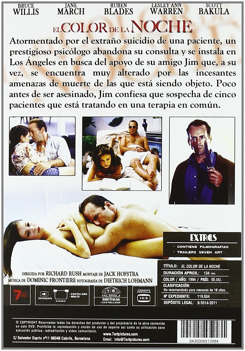 Cantidad de Discos: 1 | Lanzamiento: 2007 | Género(s): Suspenso, Intriga | Audio: Inglés, Español | Subtítulos: Español | Título: El color de la noche (1994) | Director(es): Richard Rush | Reparto: Bruce Willis, Jane March, Lesley Ann Warren, Rubén Blades, Brad Dourif, Lance Henriksen, Kevin J. O’Connor, Scott Bakula, Andrew Lowery, Eriq La Salle, Jeff Corey, Kathleen Wilhoite, Shirley Knight, John Bower, Avi Korein, Steven R. Barnett, Roberta Storm | Norma / Región: Multizona | Cantidad de Discos: 1 | Lanzamiento: 2007 | Género(s): Suspenso, Intriga | Audio: Inglés, Español | Subtítulos: Español | Título: El color de la noche (1994) | Director(es): Richard Rush | Reparto: Bruce Willis, Jane March, Lesley Ann Warren, Rubén Blades, Brad Dourif, Lance Henriksen, Kevin J. O’Connor, Scott Bakula, Andrew Lowery, Eriq La Salle, Jeff Corey, Kathleen Wilhoite, Shirley Knight, John Bower, Avi Korein, Steven R. Barnett, Roberta Storm | Norma / Región: Multizona