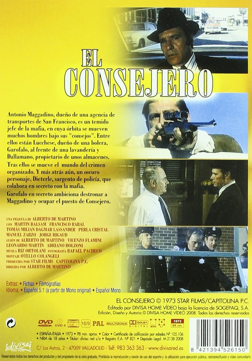 Cantidad de Discos: 1 | Lanzamiento: 2008 | Género(s): Drama | Audio: Español (Dolby Digital 5,1) | Título: Il consigliori (1973) | Director(es): Alberto De Martino | Reparto: Martin Balsam, Tomas Milian, Francisco Rabal, Dagmar Lassander, Nello Pazzafini, Perla Cristal, Carlo Tamberlani, Manuel Zarzo, John Anderson, Franco Angrisano | Norma / Región: PAL Multizona | Cantidad de Discos: 1 | Lanzamiento: 2008 | Género(s): Drama | Audio: Español (Dolby Digital 5,1) | Título: Il consigliori (1973) | Director(es): Alberto De Martino | Reparto: Martin Balsam, Tomas Milian, Francisco Rabal, Dagmar Lassander, Nello Pazzafini, Perla Cristal, Carlo Tamberlani, Manuel Zarzo, John Anderson, Franco Angrisano | Norma / Región: PAL Multizona