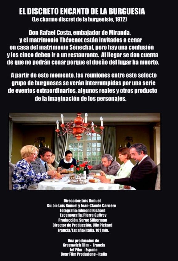 Don Rafael Costa, embajador de Miranda, y el matrimonio Thévenot están invitados a cenar en casa del matrimonio Sénechal, pero a causa de un malentendido tienen que ir a un restaurante. Cuando llegan, no pueden cenar porque el dueño del lugar ha muerto. A partir de ese momento, las reuniones de este selecto grupo de burgueses se verán siempre interrumpidas por las circunstancias más extrañas, algunas reales y otras fruto de su imaginación.