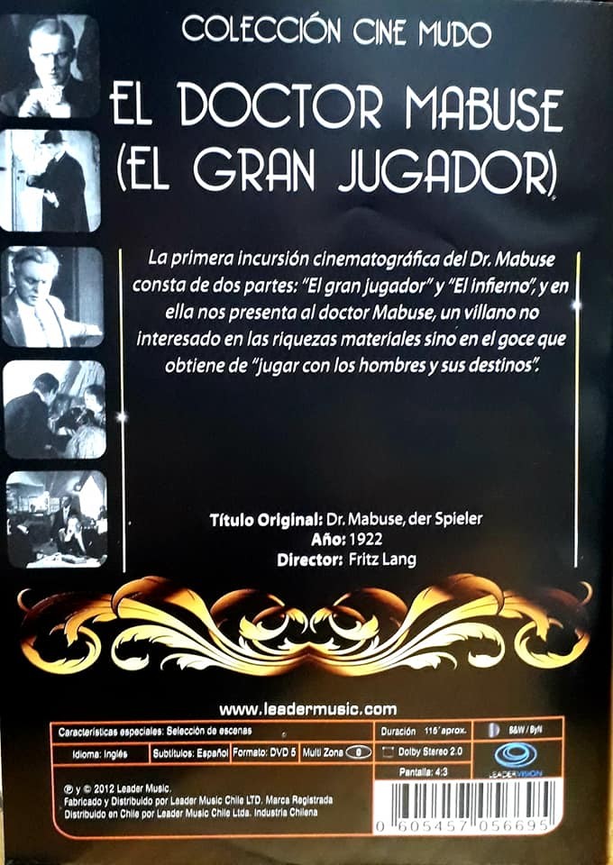 Cantidad de Discos: 1 | Lanzamiento: 1922 | Género(s): Drama, Suspenso | Audio: Inglés | Subtítulos: Español | Título: El Doctor Mabuse – El Gran jugador | Director(es): Fritz Lang | Reparto: Rudolf Klein-Rogge, Alfred Abel, Aud Egede Nissen, Bernhard Goetzke, Paul Richter, Gertrude Welcker | Norma / Región: Multizona | Cantidad de Discos: 1 | Lanzamiento: 1922 | Género(s): Drama, Suspenso | Audio: Inglés | Subtítulos: Español | Título: El Doctor Mabuse – El Gran jugador | Director(es): Fritz Lang | Reparto: Rudolf Klein-Rogge, Alfred Abel, Aud Egede Nissen, Bernhard Goetzke, Paul Richter, Gertrude Welcker | Norma / Región: Multizona