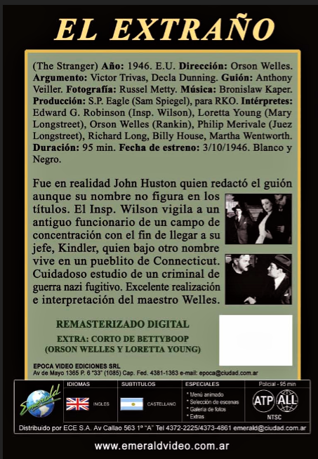 | Norma / Región: NTSC (Región 1, 4) | Cantidad de Discos: 1 | Lanzamiento: 1946 | Género(s): Thriller, Drama | Audio: Inglés | Subtítulos: Español | Título: The Stranger | Director(es): Orson Welles | Reparto: Edward G. Robinson, Loretta Young, Orson Welles, Philip Merivale, Richard Long, Konstantin Shayne, Billy House, Martha Wentworth, Byron Keith, Ethan Laidlaw, Ruth Lee, Pietro Sosso, Isabel O’Madigan, Erskine Sanford, Rebel Randall