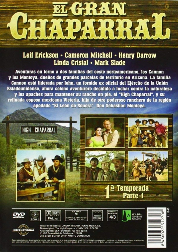 Cantidad de Discos: 3 | Lanzamiento: 2015 | Género(s): Serie de TV, Western | Audio: Español (Dolby Digital 2.0), Inglés (Dolby Digital 2.0) | TÃtulo: The High Chaparral (1967) | Director(es): David Dortort (Creador), William F. Claxton, Leon Benson, Phil Rawlins, Richard Benedict, William Witney, Joseph Pevney, Don Richardson, William Wiard | Reparto: Leif Erickson, Cameron Mitchell, Mark Slade, Linda Cristal, Henry Darrow, Don Collier, Robert F. Hoy, Roberto Contreras, Ted Markland, Rodolfo Acosta, Jerry Summers, Frank Silvera, Rudy Ramos, Henry Wills, Michael Keep, Rico Alaniz | Norma / Región: PAL (Región 2) | Cantidad de Discos: 3 | Lanzamiento: 2015 | Género(s): Serie de TV, Western | Audio: Español (Dolby Digital 2.0), Inglés (Dolby Digital 2.0) | TÃtulo: The High Chaparral (1967) | Director(es): David Dortort (Creador), William F. Claxton, Leon Benson, Phil Rawlins, Richard Benedict, William Witney, Joseph Pevney, Don Richardson, William Wiard | Reparto: Leif Erickson, Cameron Mitchell, Mark