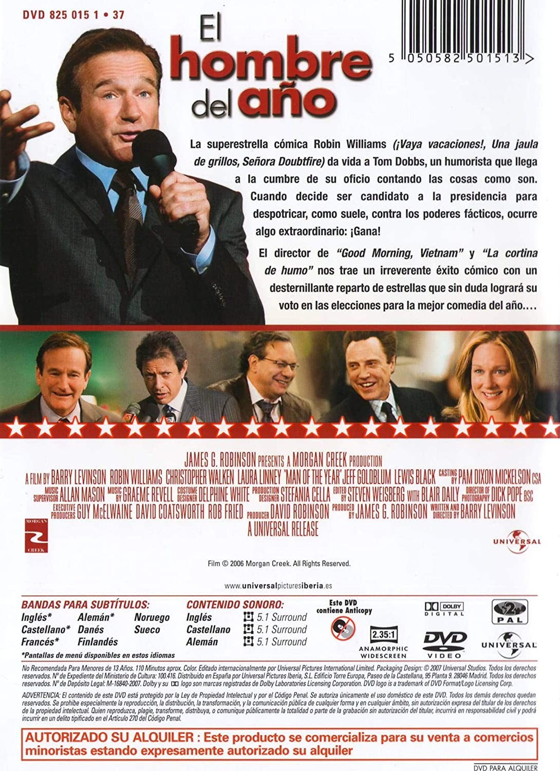 Cantidad de Discos: 1 | Lanzamiento: 2006 | Género(s): Comedia. Drama | Audio: Inglés (Dolby Digital 5,1), Español (Dolby Digital Stereo, Dolby Digital 5,1), Francés (Dolby Digital Stereo, Dolby Digital 5,1) | Subtítulos: Español, Inglés, Francés | Título: Man of the Year | Director(es): Barry Levinson | Reparto: Robin Williams, Laura Linney, Christopher Walken, Jeff Goldblum, Tina Fey, Amy Poehler, Lewis Black | Norma / Región: NTSC (Región 1, 4) | Cantidad de Discos: 1 | Lanzamiento: 2006 | Género(s): Comedia. Drama | Audio: Inglés (Dolby Digital 5,1), Español (Dolby Digital Stereo, Dolby Digital 5,1), Francés (Dolby Digital Stereo, Dolby Digital 5,1) | Subtítulos: Español, Inglés, Francés | Título: Man of the Year | Director(es): Barry Levinson | Reparto: Robin Williams, Laura Linney, Christopher Walken, Jeff Goldblum, Tina Fey, Amy Poehler, Lewis Black | Norma / Región: NTSC (Región 1, 4)