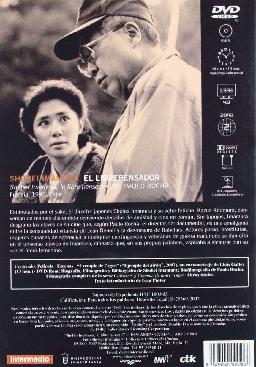 Cantidad de Discos: 1 | Lanzamiento: 1995 | Género(s): Documental | Audio: Español | SubtÃtulos: Español | TÃtulo: Cinéma, de notre temps: Shohei Imamura – Le libre penseur | Director(es): Paulo Rocha | Reparto: Documental, (intervenciones de: Shôhei Imamura, Kazuo Kitamura, Catherine Cadou, Kiyoko Ishiwata, Taeko Nakahayashi) | Norma / Región: PAL (Región 2) | Cantidad de Discos: 1 | Lanzamiento: 1995 | Género(s): Documental | Audio: Español | SubtÃtulos: Español | TÃtulo: Cinéma, de notre temps: Shohei Imamura – Le libre penseur | Director(es): Paulo Rocha | Reparto: Documental, (intervenciones de: Shôhei Imamura, Kazuo Kitamura, Catherine Cadou, Kiyoko Ishiwata, Taeko Nakahayashi) | Norma / Región: PAL (Región 2)