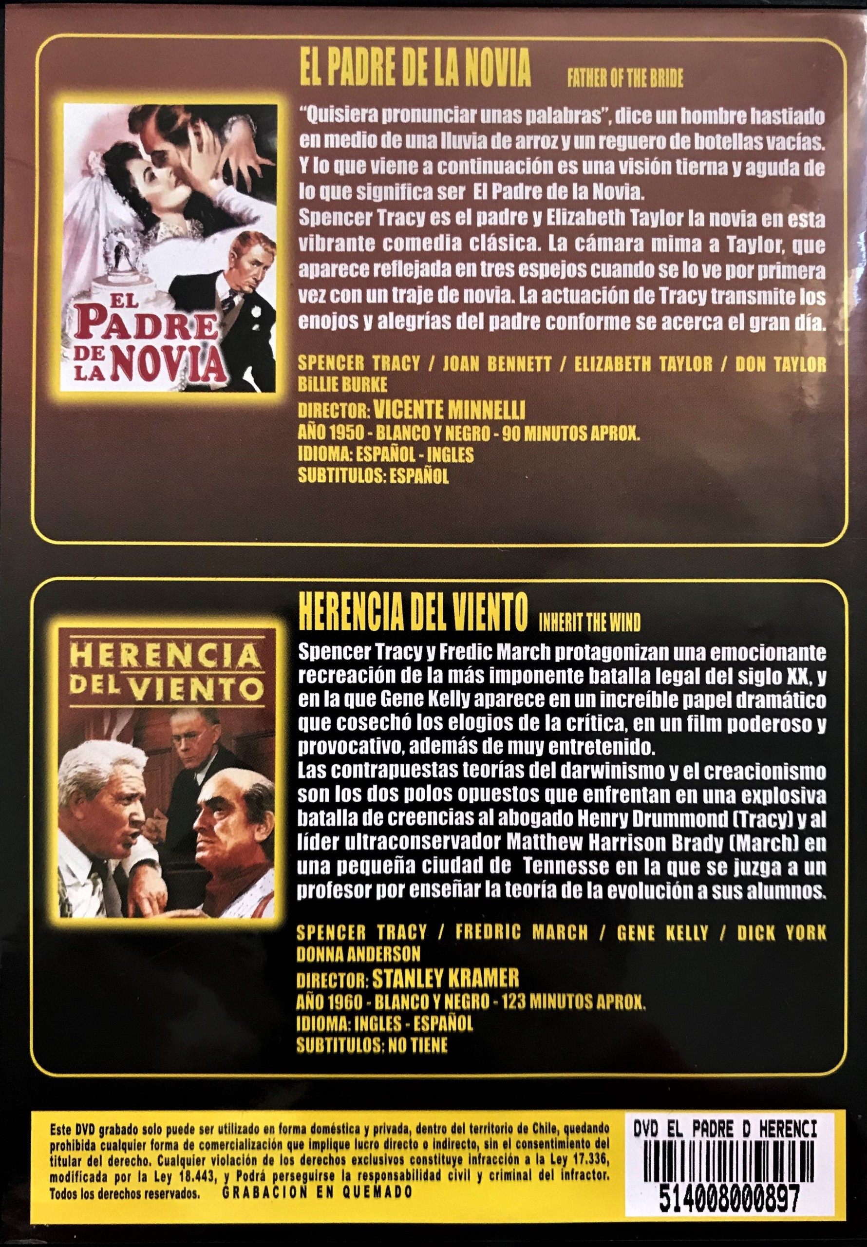 Cantidad de Discos: 2 | Lanzamiento: 2010 | Género(s): Drama, Comedia | Audio: Inglés, Español | SubtÃtulos: Español | TÃtulo: El padre de la novia (1950) / Herencia del viento (1960) | Director(es): Vincente Minnelli / Stanley Kramer | Reparto: Spencer Tracy, Elizabeth Taylor, Joan Bennett, Leo G. Carroll, Don Taylor, Billie Burke, Moroni Olsen, Russ Tamblyn, Melville Cooper, Taylor Holmes, Tom Irish, Marietta Canty, Cosmo Sardo, Oliver Blake, Frank Cady, William Haade / Spencer Tracy, Fredric March, Gene Kelly, Dick York, Claude Akins, Florence Eldridge, Donna Anderson, Noah Beery Jr., Harry Morgan | Norma / Región: Multizona | Cantidad de Discos: 2 | Lanzamiento: 2010 | Género(s): Drama, Comedia | Audio: Inglés, Español | SubtÃtulos: Español | TÃtulo: El padre de la novia (1950) / Herencia del viento (1960) | Director(es): Vincente Minnelli / Stanley Kramer | Reparto: Spencer Tracy, Elizabeth Taylor, Joan Bennett, Leo G. Carroll, Don Taylor, Billie Burke, Moroni Olsen, Russ Tamblyn, Melvi