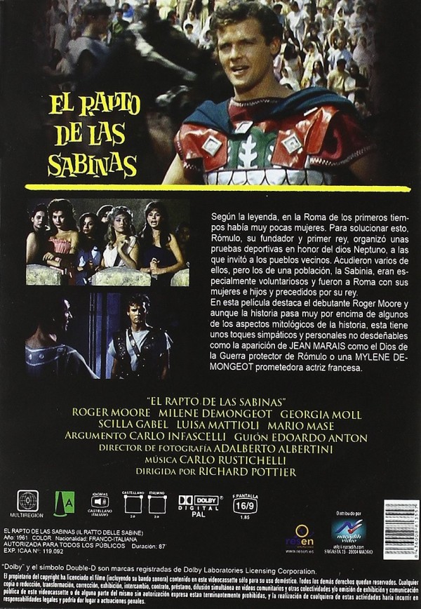 Cantidad de Discos: 1 | Lanzamiento: 1961 | Género(s): Aventuras, Comedia | Audio: Español, Italiano | SubtÃtulos: Español, Italiano | TÃtulo: El Rapto De Las Sabinas | Director(es): Richard Pottier | Reparto: Roger Moore, Mylène Demongeot, Jean Marais, Francis Blanche, Luisa Mattioli, Scilla Gabel, Folco Lulli, Marino Masé, Nietta Zocchi, Georgia Moll, Rosanna Schiaffino, Dina De Santis, Walter Barnes | Norma / Región: PAL (Región 2) | Cantidad de Discos: 1 | Lanzamiento: 1961 | Género(s): Aventuras, Comedia | Audio: Español, Italiano | SubtÃtulos: Español, Italiano | TÃtulo: El Rapto De Las Sabinas | Director(es): Richard Pottier | Reparto: Roger Moore, Mylène Demongeot, Jean Marais, Francis Blanche, Luisa Mattioli, Scilla Gabel, Folco Lulli, Marino Masé, Nietta Zocchi, Georgia Moll, Rosanna Schiaffino, Dina De Santis, Walter Barnes | Norma / Región: PAL (Región 2)
