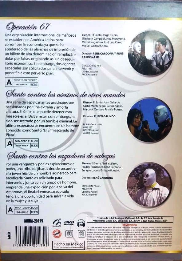 Cantidad de Discos: 1 | Lanzamiento: 2010 | Género(s): Terror. Acción. Aventuras. Ciencia ficción | Audio: Español | TÃtulo: El Santo – Operación 67 (1966) / Santo contra los asesinos de otros mundos (1973) / Santo contra los cazadores de cabezas (1969) | Director(es): René Cardona Jr., René Cardona / Rubén Galindo / René Cardona | Reparto: Santo, Jorge Rivero, Elizabeth Campbell, Noé Murayama, Midori Nagashiro, José Luis Caro, Miguel Gómez Checa, Olga Morris, MarÃa Salomé, Juan Garza, Gerardo Zepeda, René Barrera, Henry Pilusso, Manuel Galavis, Ray Mendoza, Tony Sugar, Ramiro Orci, Fernando Yapur, Armando Acosta, Jean Safont, Manuel Dondé, Rubén Márquez, Julián de Meriche, Antonio Raxel /