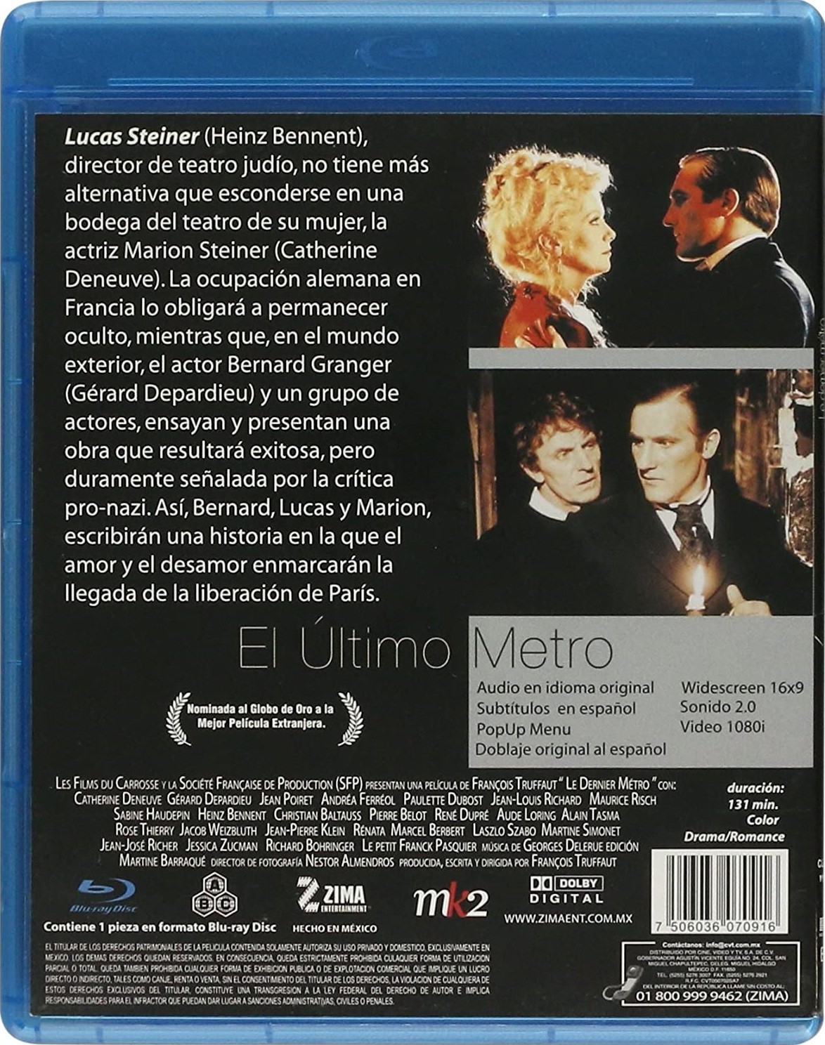 Cantidad de Discos: 1 | Lanzamiento: 1980 | Género(s): Drama | Audio: Español, Inglés, Francés | SubtÃtulos: Español, Inglés, Francés | TÃtulo: Le Dernier Metro (1980) | Director(es): François Truffaut | Reparto: Gérard Depardieu, Catherine Deneuve, Jean Poiret, Andrea Ferréol, Paulette Dubost, Jean-Louis Richard, Maurice Risch, Jean-Pierre Klein, Richard Bohringer. | Norma / Región: NTSC (Región 1, 4) | Cantidad de Discos: 1 | Lanzamiento: 1980 | Género(s): Drama | Audio: Español, Inglés, Francés | SubtÃtulos: Español, Inglés, Francés | TÃtulo: Le Dernier Metro (1980) | Director(es): François Truffaut | Reparto: Gérard Depardieu, Catherine Deneuve, Jean Poiret, Andrea Ferréol, Paulette Dubost, Jean-Louis Richard, Maurice Risch, Jean-Pierre Klein, Richard Bohringer. | Norma / Región: NTSC (Región 1, 4)