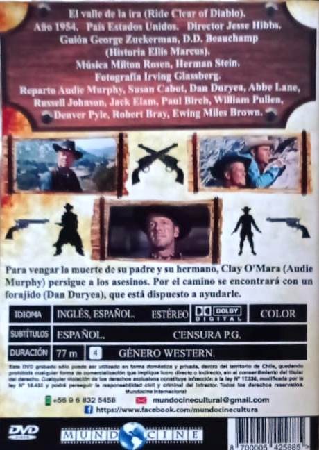 Cantidad de Discos: 1 | Lanzamiento: 2010 | Género(s): Western | Audio: Inglés | SubtÃtulos: Español | TÃtulo: Ride Clear of Diablo (1954) | Director(es): Jesse Hibbs | Reparto: Audie Murphy, Susan Cabot, Dan Duryea, Abbe Lane, Russell Johnson, Jack Elam, Paul Birch, William Pullen, Denver Pyle, Robert Bray, Ewing Miles Brown | Norma / Región: NTSC (Región 1, 4) | Cantidad de Discos: 1 | Lanzamiento: 2010 | Género(s): Western | Audio: Inglés | SubtÃtulos: Español | TÃtulo: Ride Clear of Diablo (1954) | Director(es): Jesse Hibbs | Reparto: Audie Murphy, Susan Cabot, Dan Duryea, Abbe Lane, Russell Johnson, Jack Elam, Paul Birch, William Pullen, Denver Pyle, Robert Bray, Ewing Miles Brown | Norma / Región: NTSC (Región 1, 4)